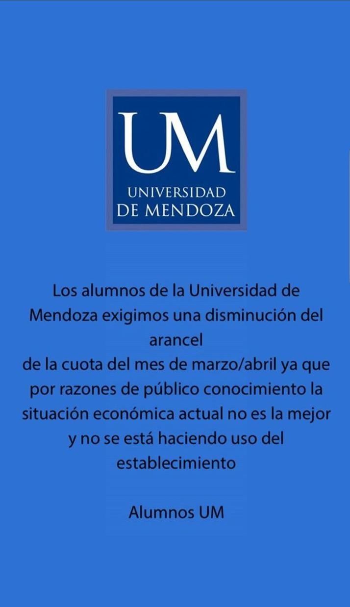 Los alumnos de la Univesidad de Mendoza, Universidad del Aconcagua y la Universidad Maza están difundiendo distintas imágenes pidiéndole a las autoridades que disminuyan el precio de las cuotas de abril y mayo.