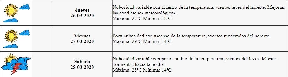 "Nubosidad variable con ascenso de la temperatura, vientos leves del noreste. Mejoran las condiciones meteorológicas. Máxima: 27ºC, Mínima: 12ºC", es el pronóstico de la Dirección de Contingencias Climáticas para hoy.