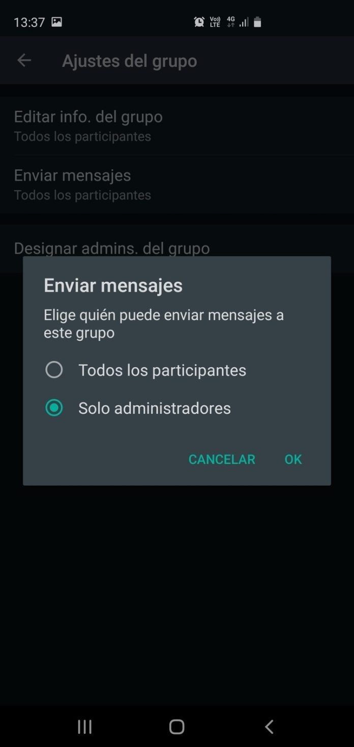 El primer paso para realizar estos cambios es ver quien es el administrador del grupo y quitarle el permiso. Luego hay que dirigirse a la configuración del chat grupal, en la parte de ajustes del grupo, enviar mensajes, allí cambiar la opción todos los participantes a sólo administradores. De esta manera solo podrán escribir en el mismo las personas que son administradoras.