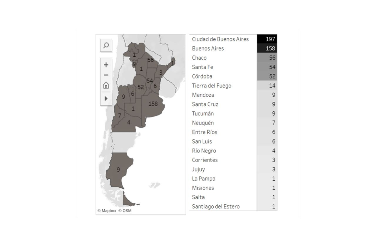 El mapa interactivo muestra en sus diferentes pestañas el avance del coronavirus en Mendoza, Argentina y Chile (para verlo, hacer clic en la imagen del mapa).