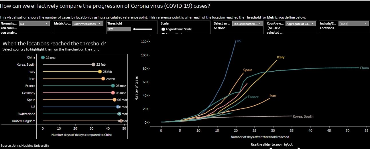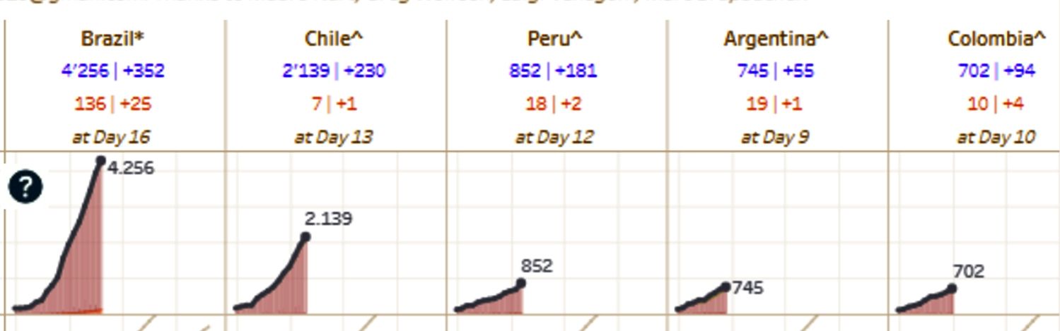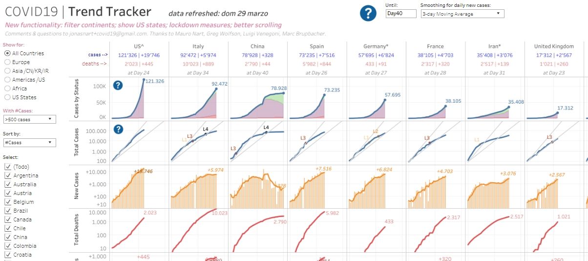 Covid19. Trend Tracker - Jonas Nart- Lo particular de esta visualización de datos es que permite distinguir rápidamente qué naciones apuntan (o no) a controlar la pandemia, con el amesatamiento de la curva.
