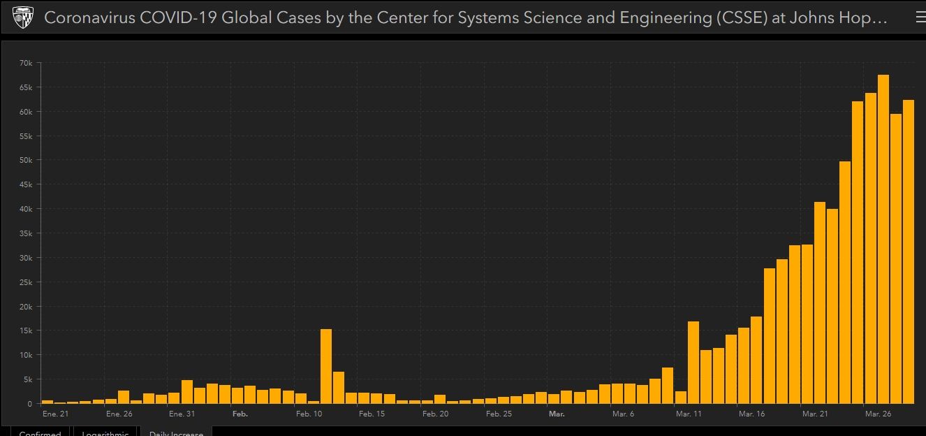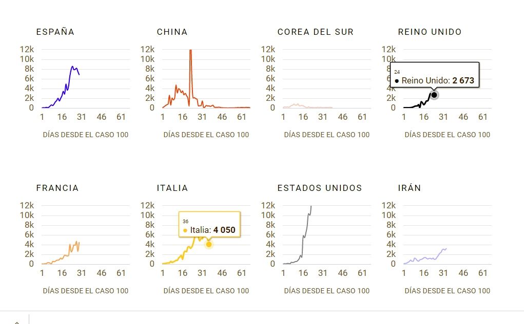 Estos datos visualizados de registros de seguimiento de la pandemia en el mundo (se pueden ver en detalle haciendo clic en la imagen), muestran una curva muy pronunciada en Estados Unidos. En tanto, en Francia se logró moderar la fuerte tendencia ascendente y España, con una curva casi vertical (como Estados Unidos), gracias a las fuertes medidas adoptadas por el gobierno de ese país, que aún no han logrado interrumpir esa tendencia ascendente. Y al igual que Italia, hay que ver qué pasa en los próximos días.