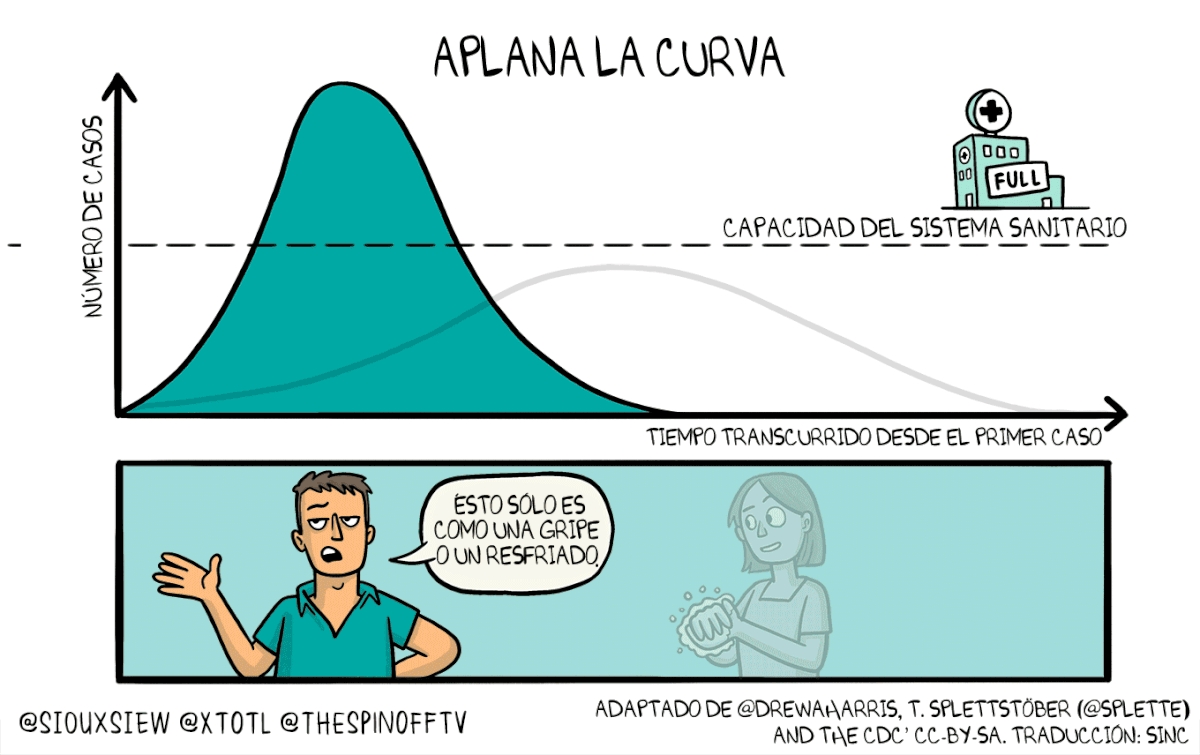 Aplanar la curva significa, como lo explica esta imagen, controlar la pandemia -es decir, que el sistema sanitario de cada país pueda atender los casos- y además, bajar los contagios.