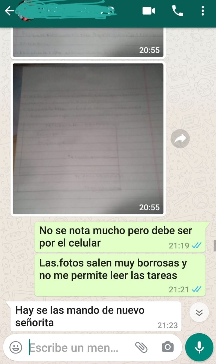El procedimiento que repite Claudia con sus alumnos todos los días es el siguiente: las actividades se envían vía whatsapp, donde también se abordan las dudas. Luego los alumnos junto con sus padres o algún mayor responsable deben realizar la tarea en un hoja, una vez finalizada los padres envían fotos para que la docente corrija desde su casa. Además, en ocasiones se les solicita que envíen videos para que la docente pueda evaluar el tiempo de lecturas de los niños.