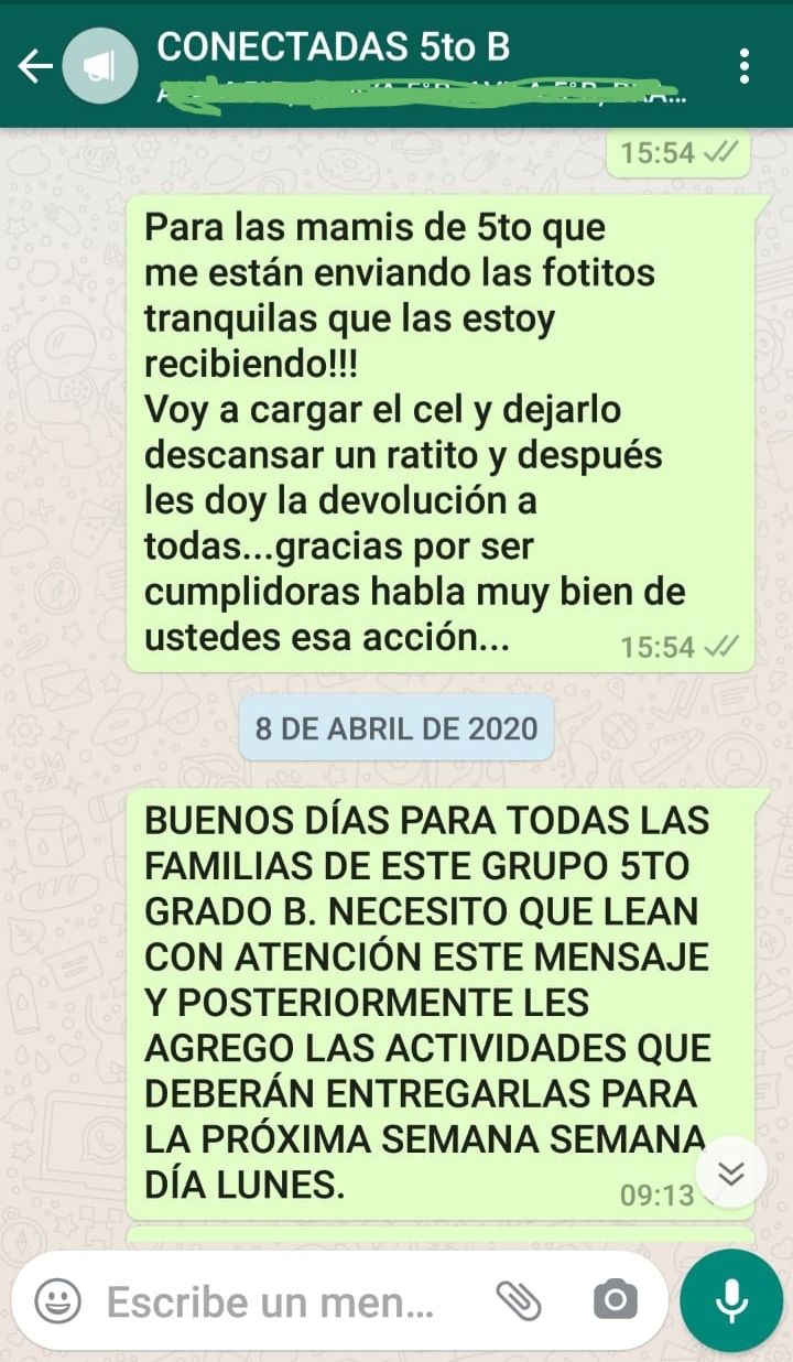 Y agrega que “si no hay respuesta por parte de los alumnos se los llama insistentemente por teléfono”, la insistencia se debe a que desde la DGE (Dirección General de Escuelas) se les solicita un informe semanal de las actividades enviadas y los nombres de los niños que no han dado respuestas.
