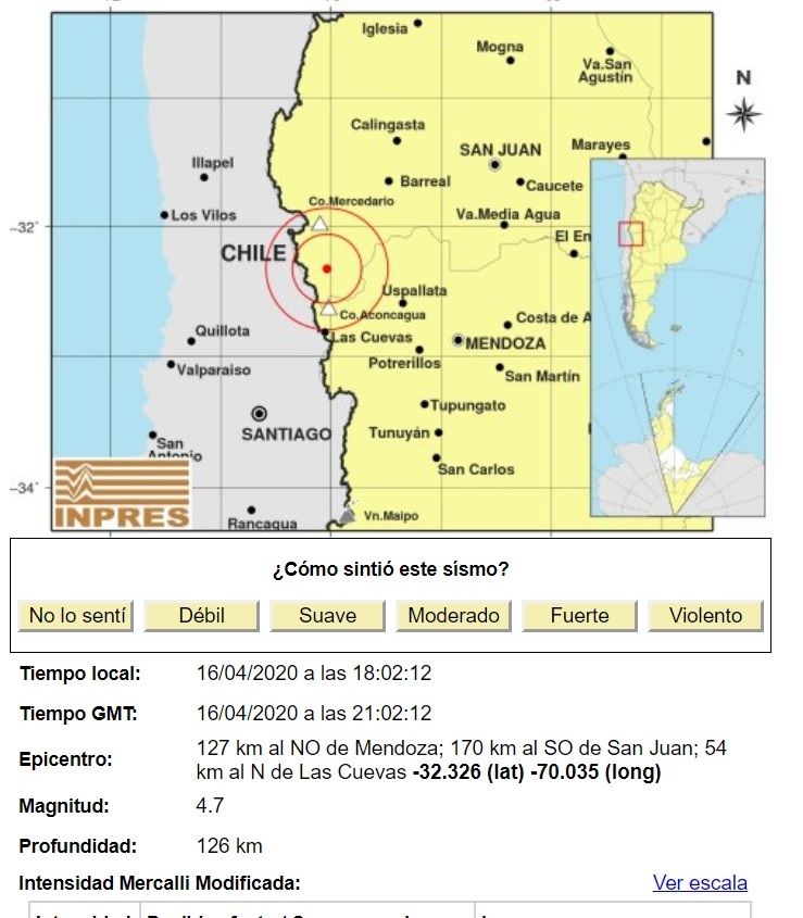 El Instituto Nacional de Prevención Sísmica precisó que el sismo ocurrió a las 18:02 hora argentina y fue de magnitud 4.7, con epicentro en la provincia de San Juan, a 170 kilómetros al suroeste de la capital de esa provincia y 120 kilómetros al noroeste del Gran Mendoza, entre los cerros Mercedario y Aconcagua, a una profundidad de 126 kilómetros.