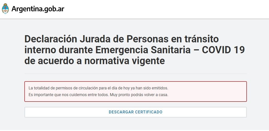 Si bien la disposición fue anunciada en los primeros minutos de hoy, antes del mediodía en la página web regresoacasa.argentina.gob.ar, donde los solicitantes deben completar la declaración jurada para realizar el traslado de manera segura, figura la siguiente leyenda: "La totalidad de permisos de circulación para el día de hoy ya han sido emitidos. Es importante que nos cuidemos entre todos. Muy pronto podrás volver a casa".