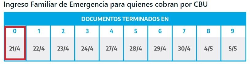 También percibirán su cobro los beneficiarios del Ingreso Familiar de Emergencia -el bono de los 10.000- cuyos documentos terminen en 0 y hayan elegido el CBU como medio de pago.