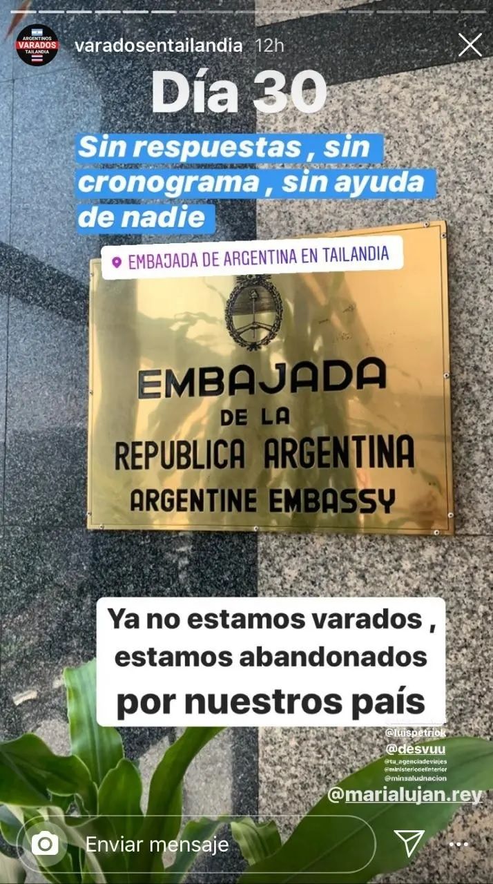 Rodrigo Rouco Oliva, le manifestó al diario mencionado lo siguiente: "No tenemos ninguna noticia, ninguna información, nunca fuimos incluidos en los planes de repatriación. Nuestra principal lucha es contra la incertidumbre". Y agregó: "No pedimos que nos vengan a buscar ni que nos regalen nada. Hay una aerolínea comercial que está operando, dispuesta a llevarnos a casa. Simplemente necesitamos que el Gobierno argentino le permita volar".