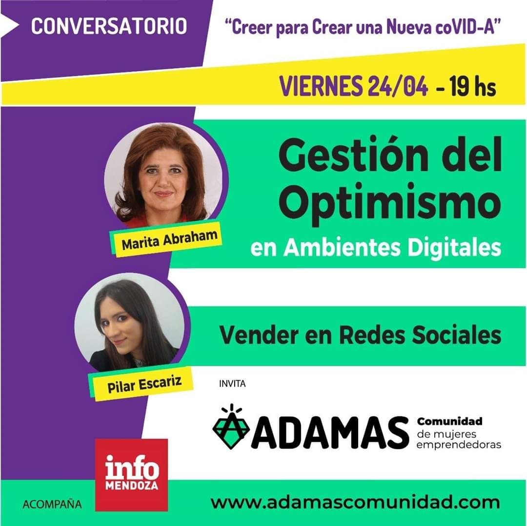 Hoy a las 19 horas se llevará a cabo la conferencia de Adamas -Comunidad de Mujeres Emprendedoras- con Marita Abraham -speaker internacional especializada en optimismo- y Pili Ezcaris especializada en ventas en redes.