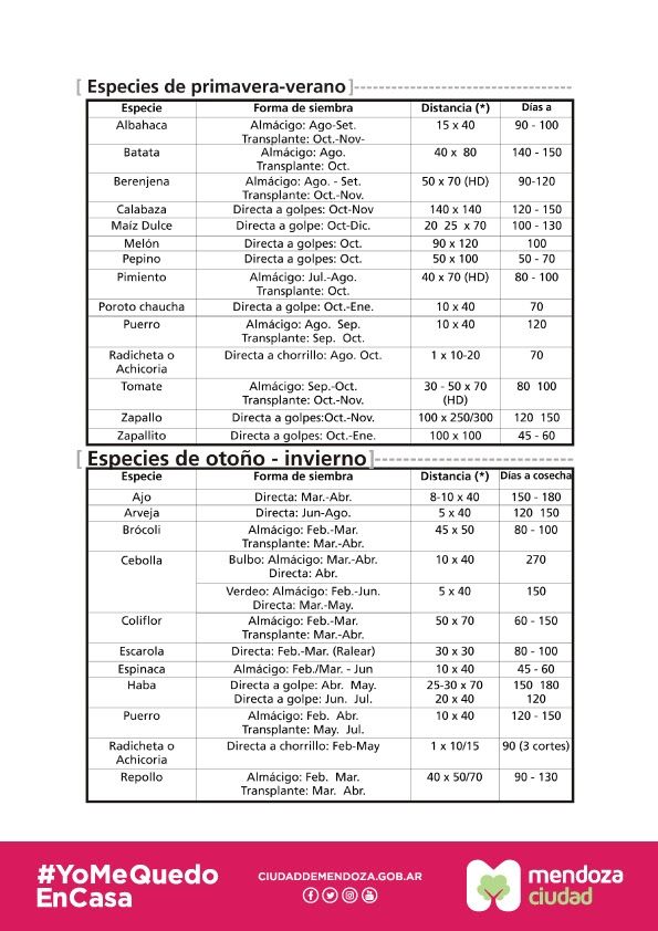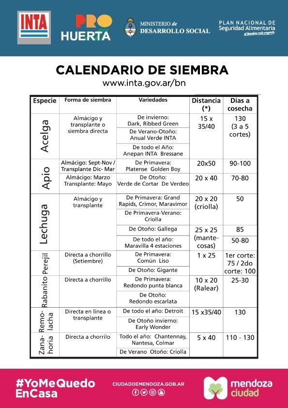 Con la idea de favorecer una buena alimentación, preservando la salud en primer lugar y atendiendo al contexto sanitario que marca la cuarentena, la Municipalidad de Ciudad de Mendoza, con el apoyo del Instituto Nacional de Tecnología Agropecuaria (INTA), a través de su Programa Pro Huerta, entregará semillas de especies vegetales para la temporada otoño-invierno.