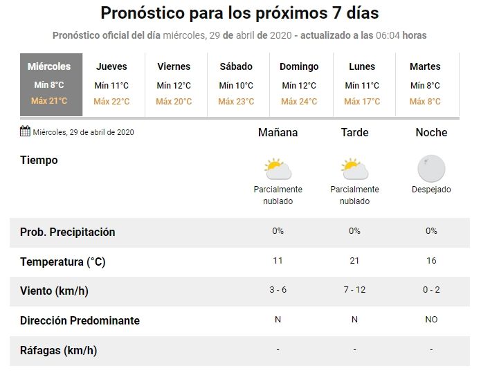 El pronóstico extendido de la Dirección de Agricultura y Contingencias Climáticas indica que el buen tiempo se mantendrá durante el resto de la semana, con pocas variaciones en las temperaturas máximas (entre 22 y 24°C) y mínimas (entre 10 y 11°C).