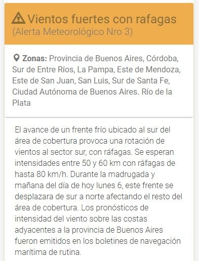 La advertencia rige también para Provincia de Buenos Aires, Córdoba, Sur de Entre Ríos, La Pampa, este de San Juan, San Luis, sur de Santa Fe y Ciudad Autónoma de Buenos Aires.