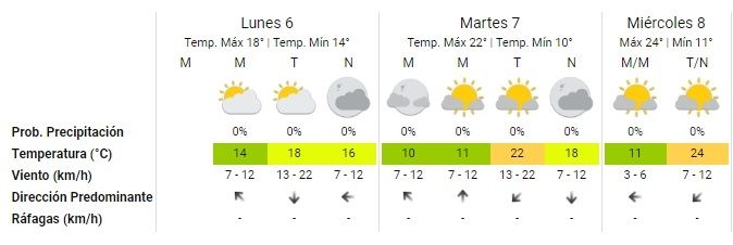El SMN emitió un alerta por vientos intensos con ráfagas que afecta al este de la provincia. "El avance de un frente frío ubicado al sur del área de cobertura provoca una rotación de vientos al sector sur, con ráfagas. Se esperan intensidades entre 50 y 60 km con ráfagas de hasta 80 km/h", explicaron.
