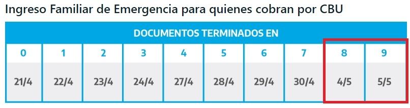 Los primeros en percibir su pago serán los beneficiarios del Ingreso Familiar de Emergencia cuyos documentos terminan en 8 y que hayan elegido el pago por CBU, ya que verán depositado el bono de 10.000 pesos el lunes 4. Un día después lo harán quienes tengan un DNI terminado en 9.