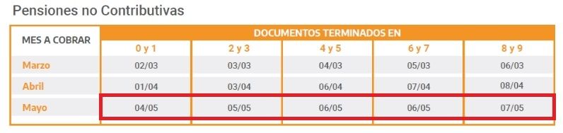 El lunes también cobrarán quienes perciban una pensión no contributiva y cuyo DNI termina 0 y 1. El martes lo harán los DNI terminados en 2 y 3, el miércoles quienes tienen documentos terminados en 4, 5, 6 y 7 y el jueves los dni terminados en 8 y 9. El viernes se pagarán, en tanto, las Asignaciones Familiares de estas pensiones no contributivas para todos los dni.