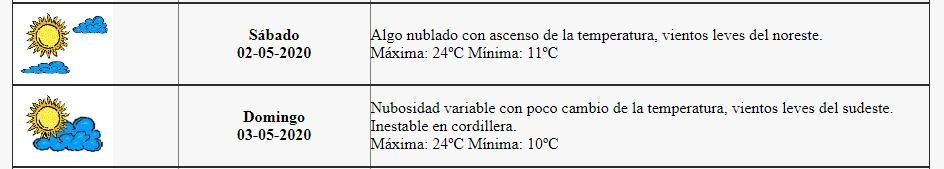 Mientras que para el domingo, se espera un cielo con nubosidad variable con poco cambio de la temperatura, vientos leves del Sudeste pero estará inestable en la cordillera.