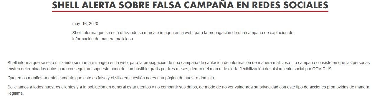 "Shell informa que se está utilizando su marca e imagen en la web, para la propagación de una campaña de captación de información de manera maliciosa. La campaña consiste en que las personas envíen determinados datos para conseguir un supuesto bono de combustible gratis por tres meses, dentro del marco de cierta flexibilización del aislamiento social por COVID-19", comenzó el comunicado.