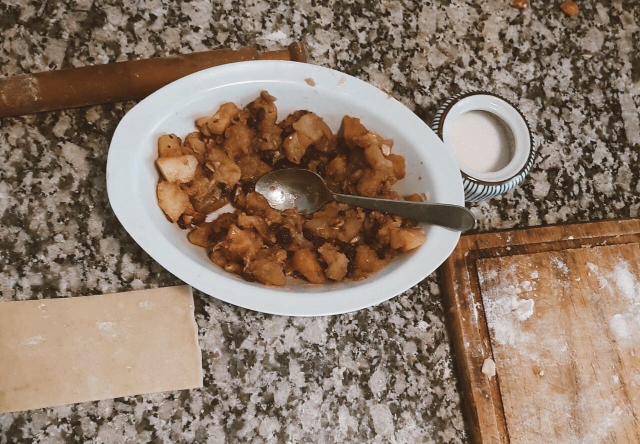 Dejamos enfriar el relleno y estiramos la masa. Hacemos rectángulos de 10 cm por 5 cm, con un espesor aproximado de medio centímetro. Hecho esto, colocamos el relleno en el medio y juntamos los extremos.