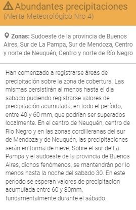 En nuestra provincia indicaron que las precipitaciones se darán en forma de nieve, y serán cercanas a la zona cordillerana: "En el centro de Neuquén, centro de Río Negro y en las zonas cordilleranas del sur de Mendoza y de Neuquén, las precipitaciones serán en forma de nieve".
