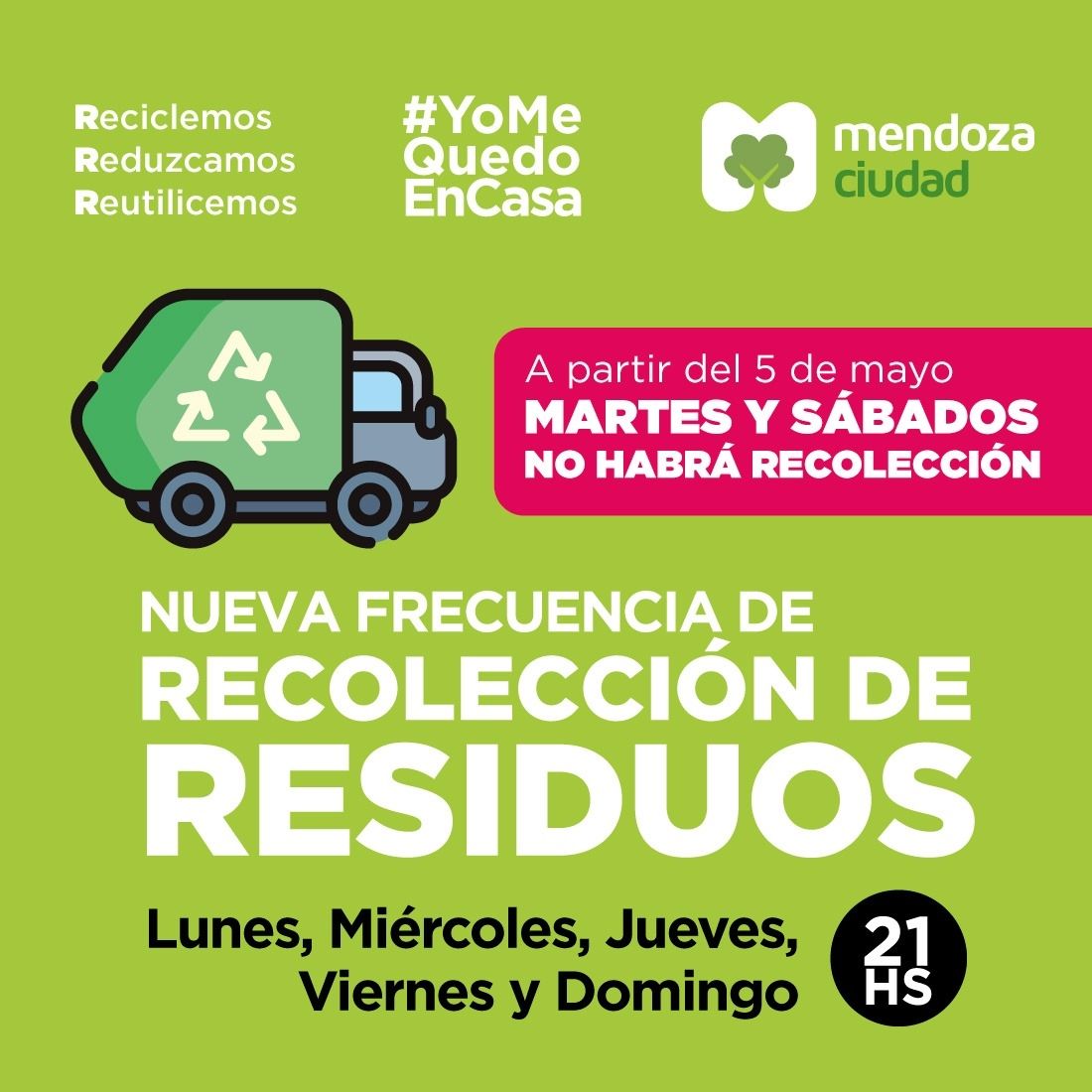 La Municipalidad de la Ciudad de Mendoza lleva adelante una estrategia para promover prácticas de reducción, reutilización y reciclado de diferentes materiales antes de que los mismos sean considerados como “residuos”. Como parte de la misma, informa que, a partir del 5 de mayo, no habrá más recolección de residuos los días martes y sábados, por lo que esos días de cada semana, los vecinos no deberán sacar sus desechos domiciliarios. De esta manera, a través de un proceso de colaboración entre los vecinos y el municipio, se busca generar un mayor aprovechamiento de materiales y reducir el impacto generado por los residuos sobre el ambiente.