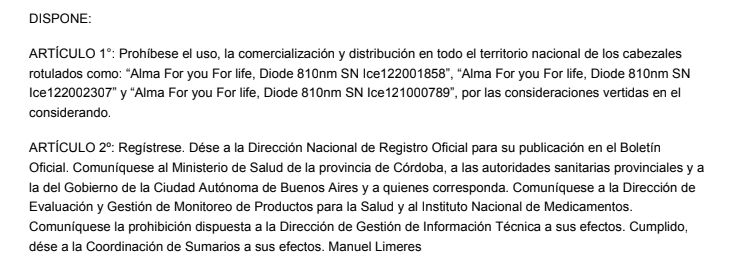 Con el fin de proteger a eventuales adquirentes y usuarios del producto involucrado, del que se desconoce su estado y condición, la Dirección de Evaluación y Gestión de Monitoreo de Productos para la Salud sugirió prohibir el uso, la comercialización y distribución de los cabezales rotulados como: "Alma For you For life, Diode 810nm SN Ice122001858", "Alma For you For life, Diode 810nm SN Ice122002307" y "Alma For you For life, Diode 810nm SN Ice121000789".