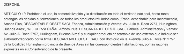Por otra parte, la Anmat señaló en la disposición 2545/2020 que se prohíbe el uso, la comercialización y la distribución en todo el territorio nacional, hasta tanto obtenga las debidas autorizaciones, de todos los productos rotulados como: "Pañal desechable para incontinencia, Ambos Plus, DESCARTABLE OESTE SACI" y cualquier producto descartable de uso externo que indique ser elaborado/fabricado por la firma DESCARTABLE OESTE SACI con domicilio en la Avenida Julio A. Roca N° 2757 de la localidad Hurlingham. Según informaron, se trata de unidades de las que se desconocen sus condiciones de elaboración y/o fabricación.
