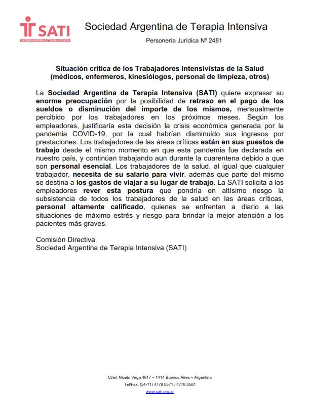 La Sociedad Argentina de Trabajadores de Terapia Intensiva (SATI) emitió un comunicado por la posibilidad de retraso en el pago de salarios y disminución de los mismos para los médicos, enfermeros, kinesiólogos, personal de limpieza, entre otros.