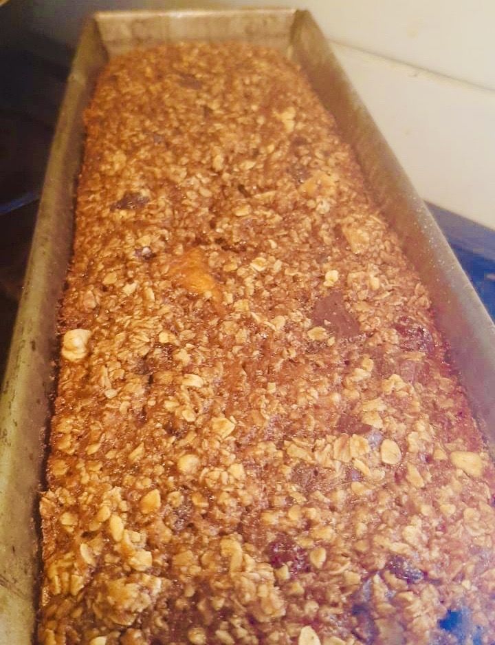 3. Tomamos todos los ingredientes secos : avena, chocolate ,pasas de uva, nueces, canela, cucharadita de polvo de hornear.