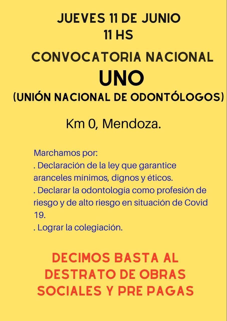 La convocatoria en Mendoza, realizada por la Unión Nacional de Odontólogos, es para reunirse en el Kilómetro 0 (Peatonal Sarmiento y avenida San Martín) de la Ciudad de Mendoza.