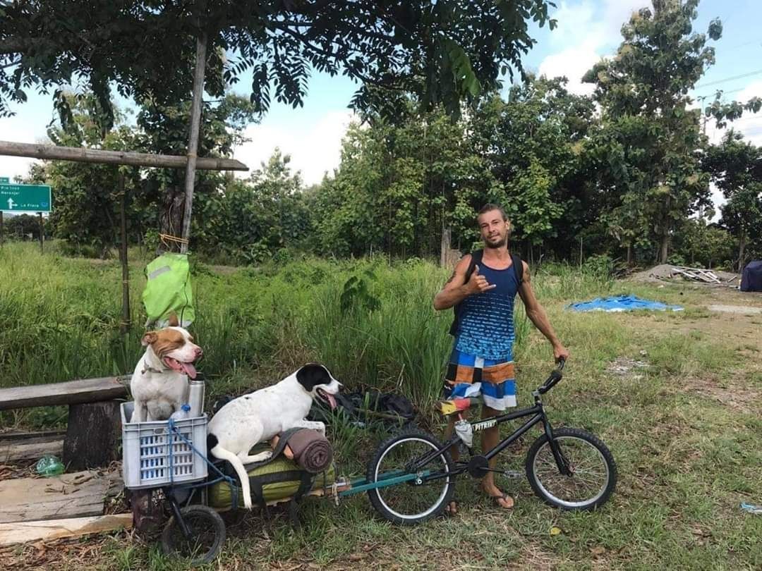 Sin muchas más opciones, contó que está dispuesto a viajar en bicicleta desde allá junto a sus mascotas. “Vendí mi tabla de surf y compré una bici”, reveló al medio local peruano Líbero. También aclaró que a los perros los conoció hace meses, cuando viajaba por Colombia y Ecuador.