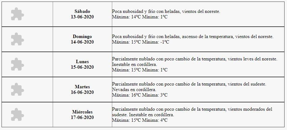 El domingo será similar, con mucho frío en la mañana, pero mejorando hacia la tarde. "Poca nubosidad y frío con heladas, ascenso de la temperatura y vientos del noreste", indica el pronóstico.