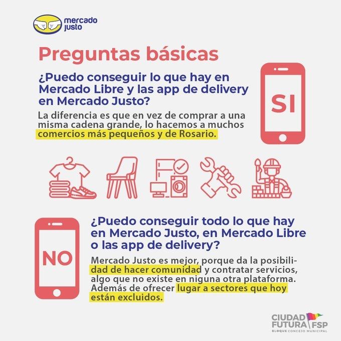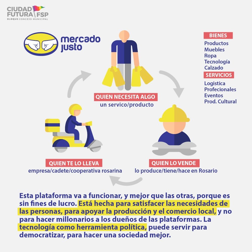 Además muchos rubros y pymes que antes no tenían un canal online, se sumaron rápidamente para no perder su negocio por completo. Sin embargo se volvió muy competitivo y los "principiantes" perdían contra quienes tenían más aceitado el canal electrónico de ventas. En este marco de situación desde Ciudad futura en Rosario idearon una forma para que quienes ofrecen productos o servicios en esa ciudad pudieran competir en el mundo digital. Se trata Mercado justo, una plataforma de gestión estatal aprobada por el Concejo por unanimidad donde las "comisiones no sean abusivas" y se priorice el comercio local. "Usamos un logo similar al de Mercado libre como una estrategia para comunicar el proyecto", comenta la concejala Caren Tepp, pero "no significa que será la imagen definitiva".