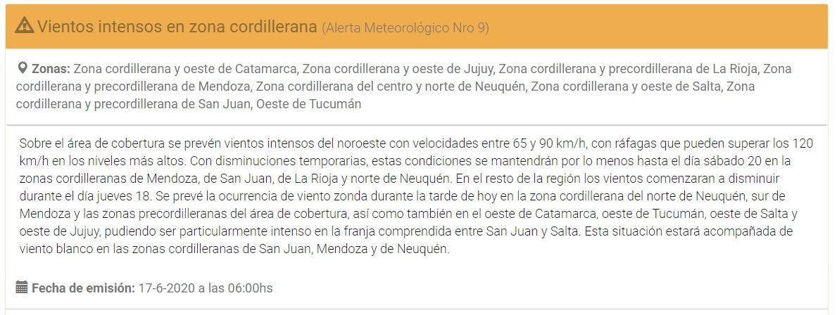 "Se prevé la ocurrencia de viento Zonda durante la tarde de hoy en la zona cordillerana del norte de Neuquén, sur de Mendoza y las zonas precordilleranas del área de cobertura, así como también en el oeste de Catamarca, oeste de Tucumán, oeste de Salta y oeste de Jujuy, pudiendo ser particularmente intenso en la franja comprendida entre San Juan y Salta", agrega el alerta. Los vientos recién comenzarían a disminuir a partir de la tarde de mañana.