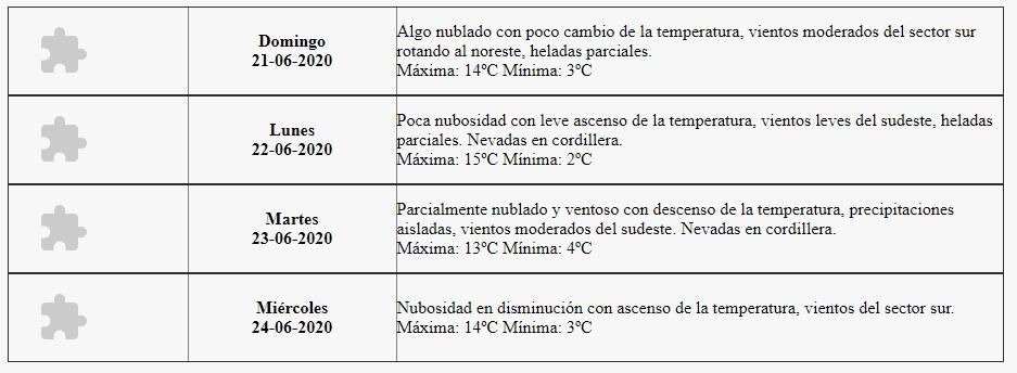 "Algo nublado con poco cambio de la temperatura, vientos moderados del sector sur rotando al noreste, heladas parciales", indica el pronóstico. La mínima será de 3 grados.