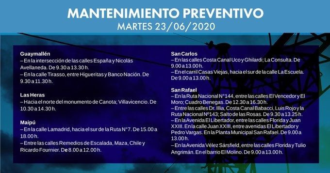 Se trata de tareas de mantenimiento preventivo que se realizarán en distintos departamentos de la provincia. Aquí, el detalle de horarios y zonas donde el suministro eléctrico podría sufrir complicaciones.