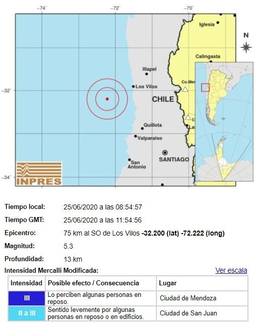 Inpres indicó que el sismo se produjo a las 8.54. Los datos definitivos que dio el organismo confirmó que el movimiento se sintió en Mendoza levemente, y también en San Juan.