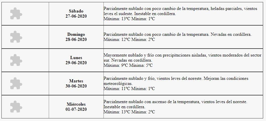 "Parcialmente nublado con poco cambio de la temperatura, heladas parciales, vientos leves el sudeste. Inestable en cordillera", indica Contingencias.