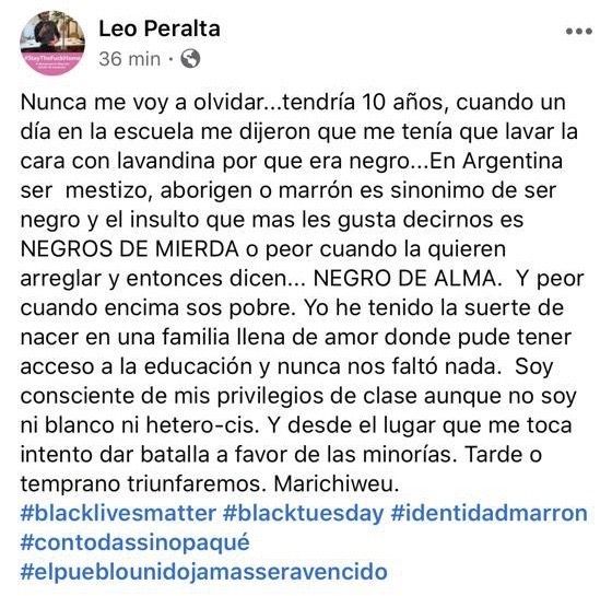 "Tengo una parte española, una parte italiana, una parte Ranquel -aborígenes originarios de la pampa- y una parte -la que me da el apellido- que no sabemos. Todo viene del hijo natural de un estanciero y una criada en una ascienda en Córdoba.. Que lo separaron de su madre desde chiquito. El más 'moreno' y de pelo bien rizado de toda la familia, mi abuelo paterno. Que le enseñaron a no saber de donde venía. Y siempre nos contaba que lo único que sabía es que en realidad Peralta no era su verdadero apellido, si no Ledesma", cuenta a propósito de esto Leo Peralta, el diseñador mendocino que aportaba testimonio al comienzo de la nota.