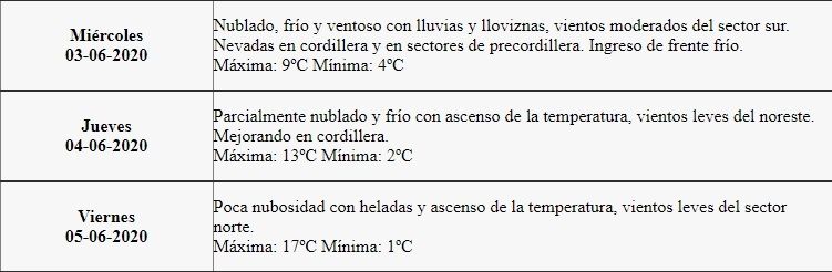 "Parcialmente nublado y frío con ascenso de la temperatura, vientos leves del noreste. Mejorando en cordillera. Máxima: 13ºC Mínima: 2ºC", es la estimación del organismo provincial para este jueves.