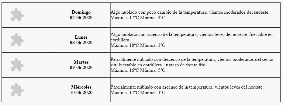 Lo que resta de la mañana, el cielo permanecerá despejado y la temperatura será de 4 ºC. A la tarde, en tanto, estará algo nublado y la temperatura subirá a los 16 ºC; mientras que a la noche, continuarán las mismas condiciones de nubosidad y la temperatura caerá a los 10 ºC.