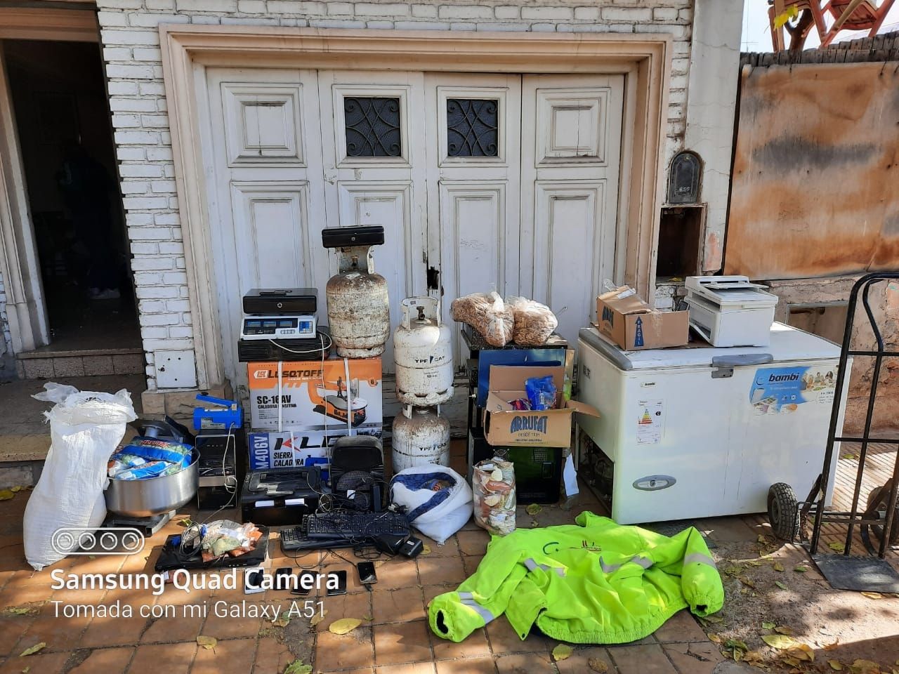 Tenían una notebook, un freezer, tres balanzas, 3 CPU, una sierra caladora, una sierra sin fin, una freidora industrial, una amasadora, 3 garrafas de 10 kg, 2 cajas fuertes metálicas negras portátiles, un parlante, una selladora por impulso, dos impresoras, 7 celulares, municiones, 3 teclados, un juego de parlantes de PC, una campera de la Municipalidad, golosinas, condimentos varios, un mouse y un sacapuntas, entre otros bienes.