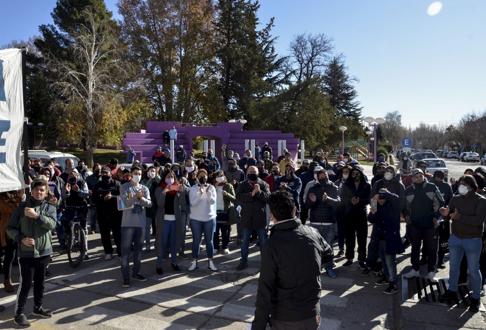Los vecinos marcharon y se concentraron afuera de la sede municipal donde el intendente Juan Manuel Ojeda prometió “llevar la lucha por la continuidad de la obra porque se trata de un escándalo internacional”.