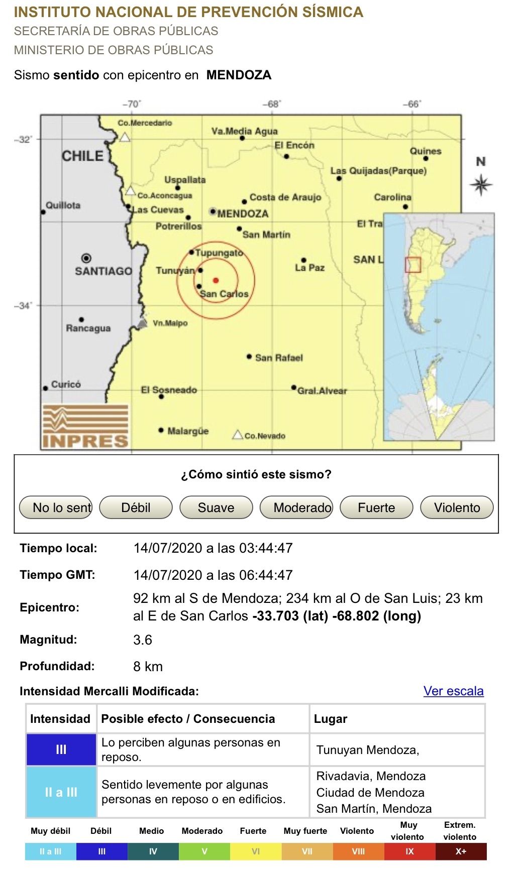 El centro de investigaciones y prevención detalla además que, al considerarse "débil" según la intensidad medida en la escala de Mercalli, fue un movimiento que para muchos pasó desapercibido, y que pudo ser detectado por quienes se encontraban en situación de reposo o en edificios altos.