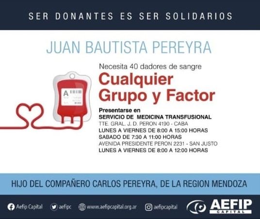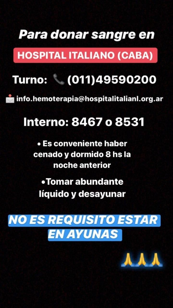 Quienes puedan donar, deben acercarse al Servicio de Medicina Transfusional en Tte. Gral. Perón al 4190 de CABA, de lunes a viernes de 8 a 15 y los sábados de 7.30 a 11 o en la Avenida Presidente Perón al 2231 de San Justo, de lunes a viernes de 8 a 12.