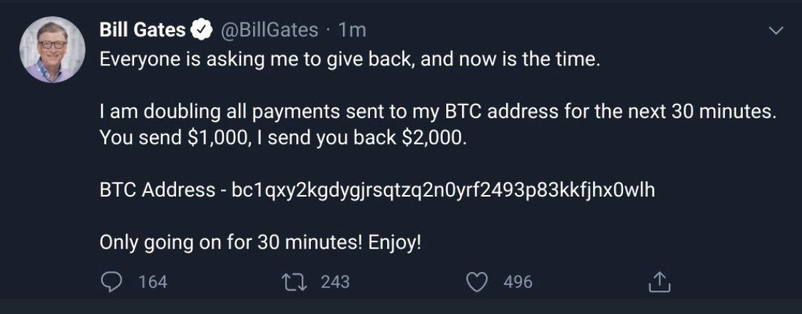 Tras los hackeos empezaron a tuitear mensajes con un mismo fin, las transferencias de bitcoin de parte de sus seguidores. En el caso del magnate empresarial Bill Gates tuiteo lo siguiente: "Todos me piden que retribuya, y ahora es el momento. Duplico todos los pagos enviados a mi dirección de Bitcoin durante los próximos 30 minutos. Me envías $1.000, te devuelvo $2.000".
