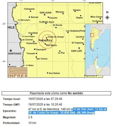El segundo fue en Lavalle y se trató de un sismo de 2.6 de magnitud. Específicamente, el organismo informó que se registró un temblor a 10 km de profundidad, con epicentro a "47 km al E de Mendoza; 149 km al S de San Juan; 12 km al SE de Costa De Araujo -32.850 (lat) -68.340 (long)".
