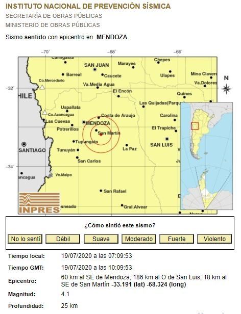 Según el Inpres, el epicentro del primero, el más fuerte, tuvo epicentro en San Martín y fue de 4.1 de magnitud, y a 25 km de profundidad. Exactamente ocurrió a 60 km al SE de Mendoza; 186 km al O de San Luis; 18 km al SE de San Martín.