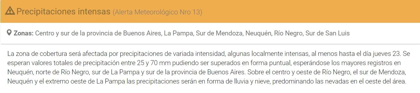 El primer alerta refiere a la ocurrencia de "precipitaciones intensas" y abarca el sur de Mendoza, el centro y sur de la provincia de Buenos Aires, La Pampa, Neuquén, Río Negro y sur de San Luis. Dichas lluvias serán "de variada intensidad, algunas localmente intensas, al menos hasta el día jueves 23".