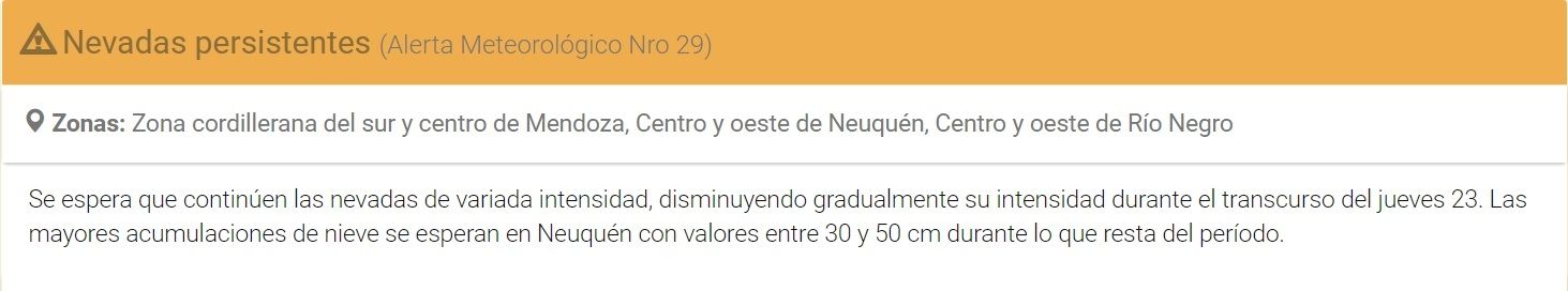 Por otro lado, el organismo advirtió sobre el desarrollo de "nevadas persistentes" en la zona cordillerana del sur y centro de Mendoza, centro y oeste de Neuquén, y centro y oeste de Río Negro, las cuales serán "de variada intensidad, disminuyendo gradualmente su intensidad durante el transcurso del jueves 23".